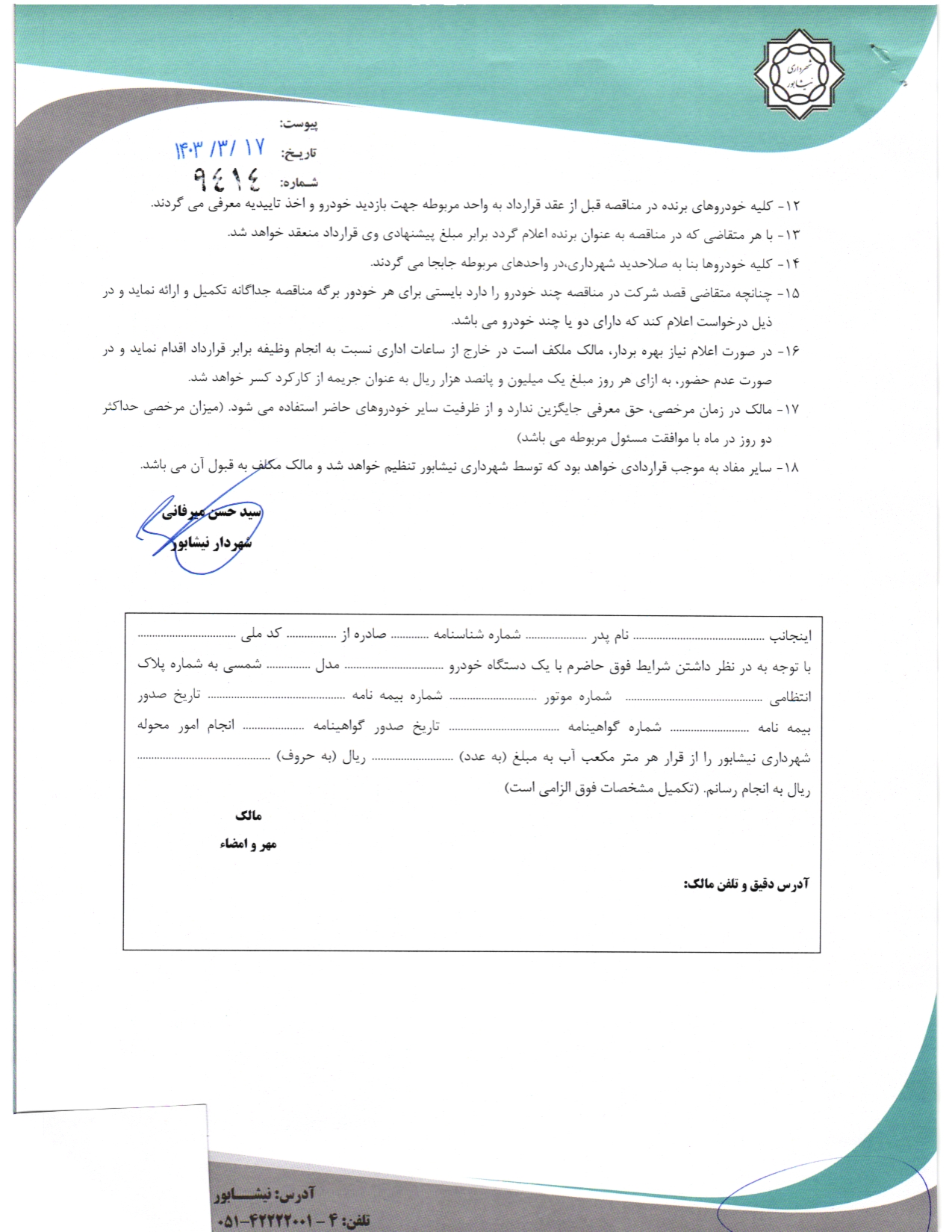 - سایر مفاد به موجب قراردادی خواهد بود که توسط شهرداری نیشابور تنظیم خواهد شد و مالک مکلف به قبول آن می باشد.
