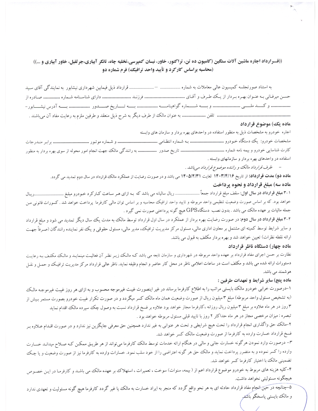 - برنده مناقصه بایستی نسبت به ارائه ضمانت حسن انجام تعهدات شامل یک فقره چک به مبلغ پانصد میلیون ریال و همچنین عقد قرارداد ظرف مدت یک هفته اقدام نماید، در غیر اینصورت ضمانت نامه یا سپرده وی ضبط و در صورت تعیین نفرات بعدی توسط کمیسیون قرارداد با نفر بعدی منعقد خواهد شد. در صورت عقد قرارداد برنده با شهرداری مبلغ چهل میلیون ریال (سپرده) بعنوان هزینه دستگاه GPS نزد شهرداری تا پایان مدت قرارداد باقی خواهد ماند تا در صورت ایراد خسارت یا مفقودی GPS هزینه مربوطه از محل چهل میلیون ریال محاسبه و به نفع شهرداری اقدام گردد و در غیر اینصورت مبلغ چهل میلیون ریال در آخرین صورت وضعیت (ماه 22) به مالک پرداخت خواهد شد.