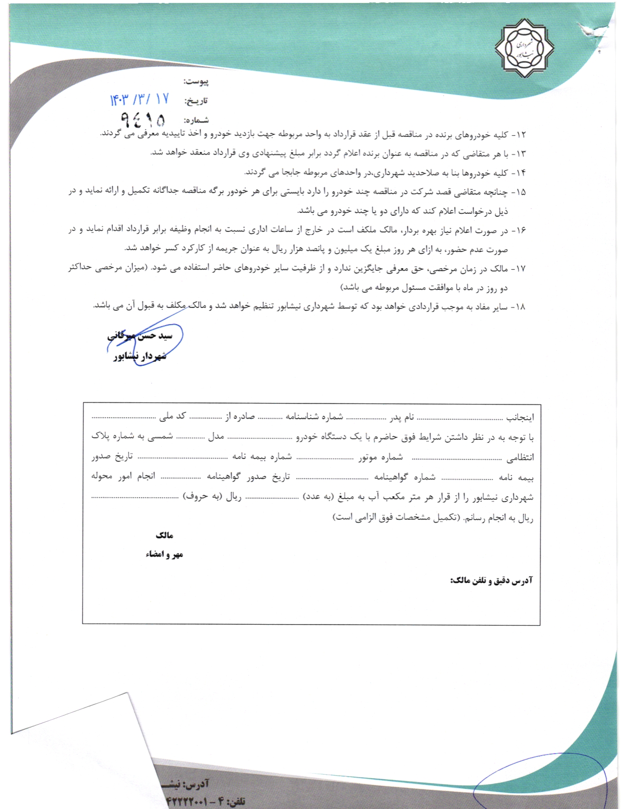 18. سایر مفاد به موجب قراردادی خواهد بود که توسط شهرداری نیشابور تنظیم خواهد شد و مالک مکلف به قبول آن می باشد.