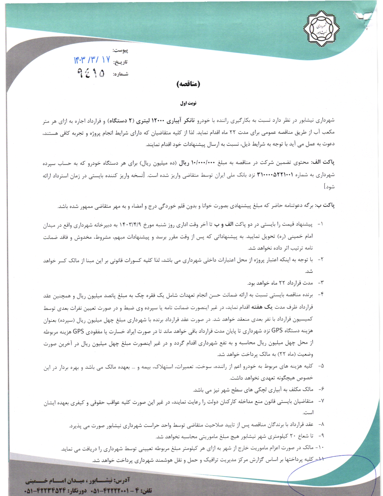 شهرداری نیشابور در نظر دارد نسبت به بکارگیری راننده با خودرو تانکر آبیاری 12000 لیتری (2 دستگاه) و قرارداد اجاره به ازای هر متر مکعب آب از طریق مناقصه عمومی برای مدت 22 ماه اقدام نماید. لذا از کلیه متقاضیان که دارای شرایط انجام پروژه و تجربه کافی هستند، دعوت به عمل می آید با توجه به شرایط ذیل، نسبت به ارسال پیشنهادات خود اقدام نمایند.