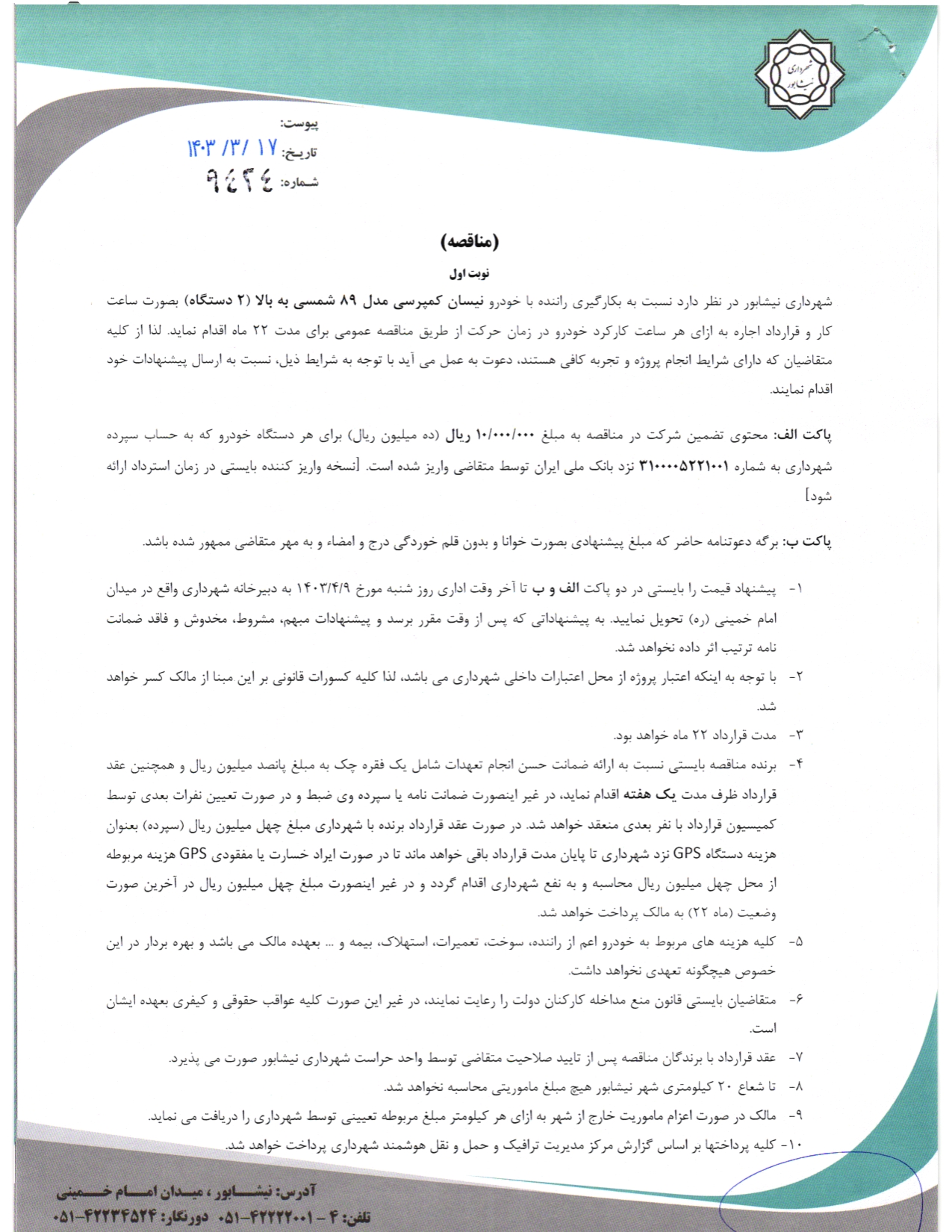 - عقد قرارداد با برندگان مناقصه پس از تایید صلاحیت متقاضی توسط واحد حراست شهرداری نیشابور صورت می پذیرد.