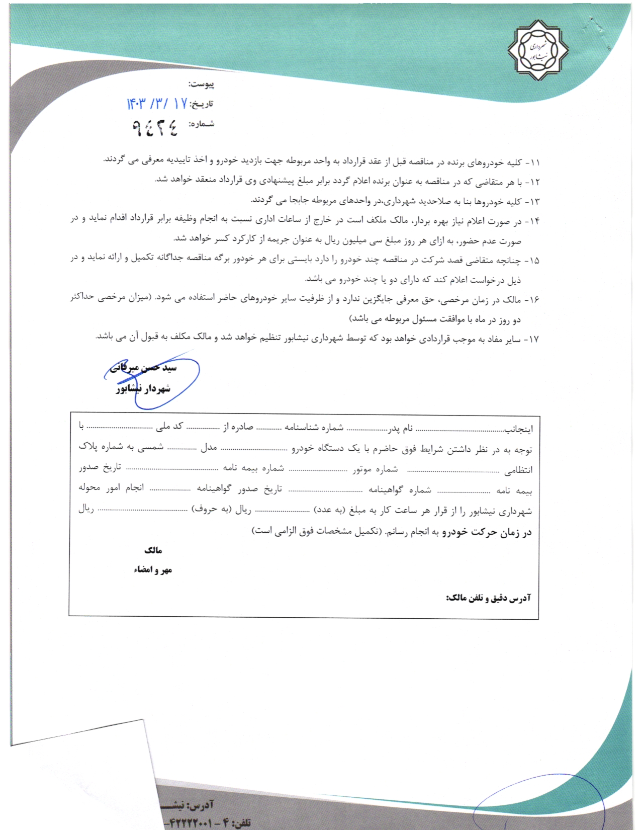 - سایر مفاد به موجب قراردادی خواهد بود که توسط شهرداری نیشابور تنظیم خواهد شد و مالک مکلف به قبول آن می باشد.