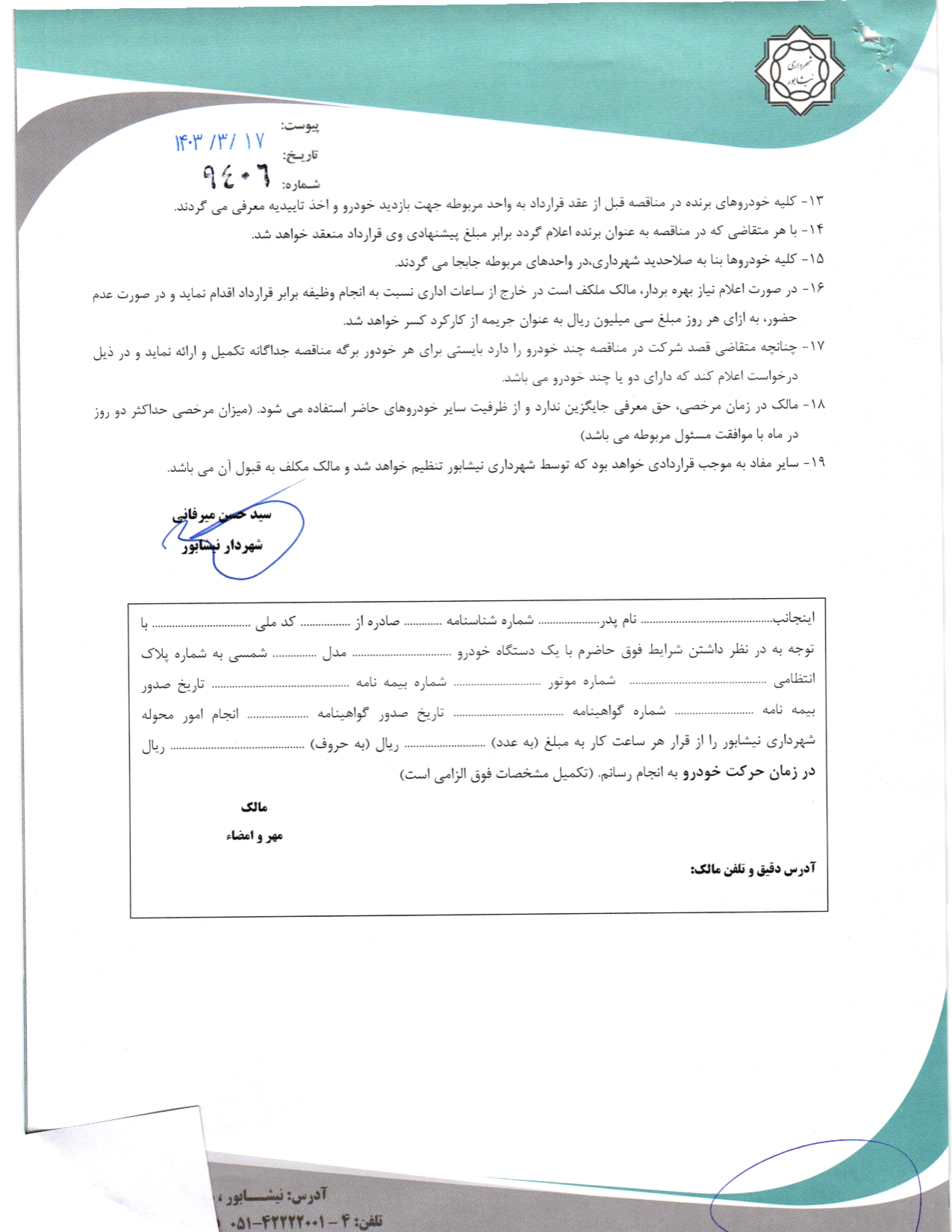 - سایر مفاد به موجب قراردادی خواهد بود که توسط شهرداری نیشابور تنظیم خواهد شد و مالک مکلف به قبول آن می باشد.