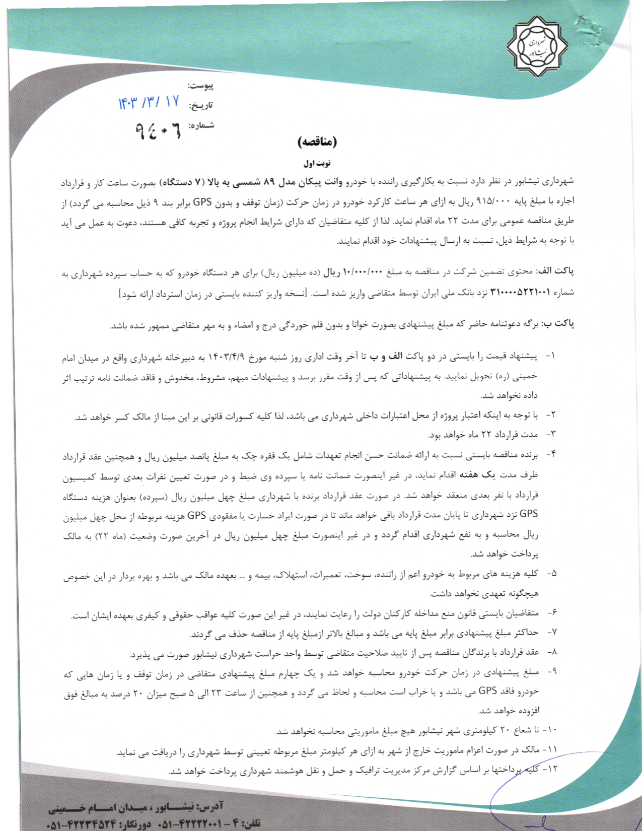 شهرداری نیشابور در نظر دارد نسبت به بکارگیری راننده با خودرو وانت پیکان مدل 89 شمسی به بالا (7 دستگاه) بصورت ساعت کار و قرارداد اجاره با مبلغ پایه 915/000 ریال به ازای هر ساعت کارکرد خودرو در زمان حرکت (زمان توقف و بدون GPS برابر بند 9 ذیل محاسبه می گردد) از طریق مناقصه عمومی برای مدت 22 ماه اقدام نماید. لذا از کلیه متقاضیان که دارای شرایط انجام پروژه و تجربه کافی هستند، دعوت به عمل می آید با توجه به شرایط ذیل، نسبت به ارسال پیشنهادات خود اقدام نمایند.
