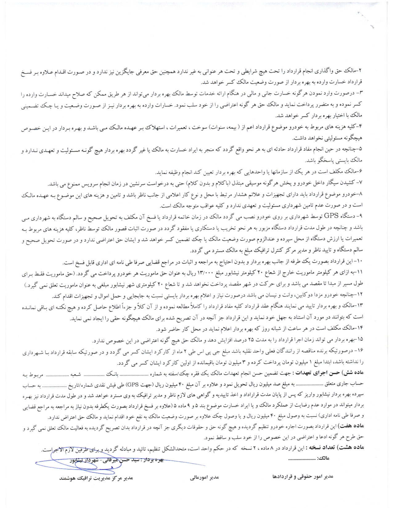 - کلیه هزینه های مربوط به خودرو اعم از راننده، سوخت، تعمیرات، استهلاک، بیمه و ... بعهده مالک می باشد و بهره بردار در این خصوص هیچگونه تعهدی نخواهد داشت.