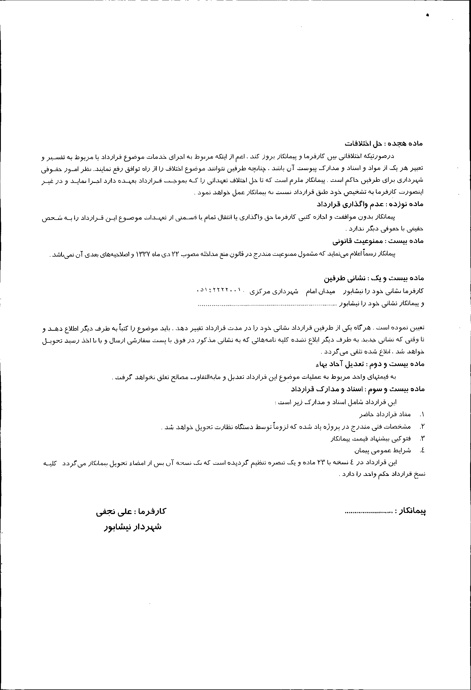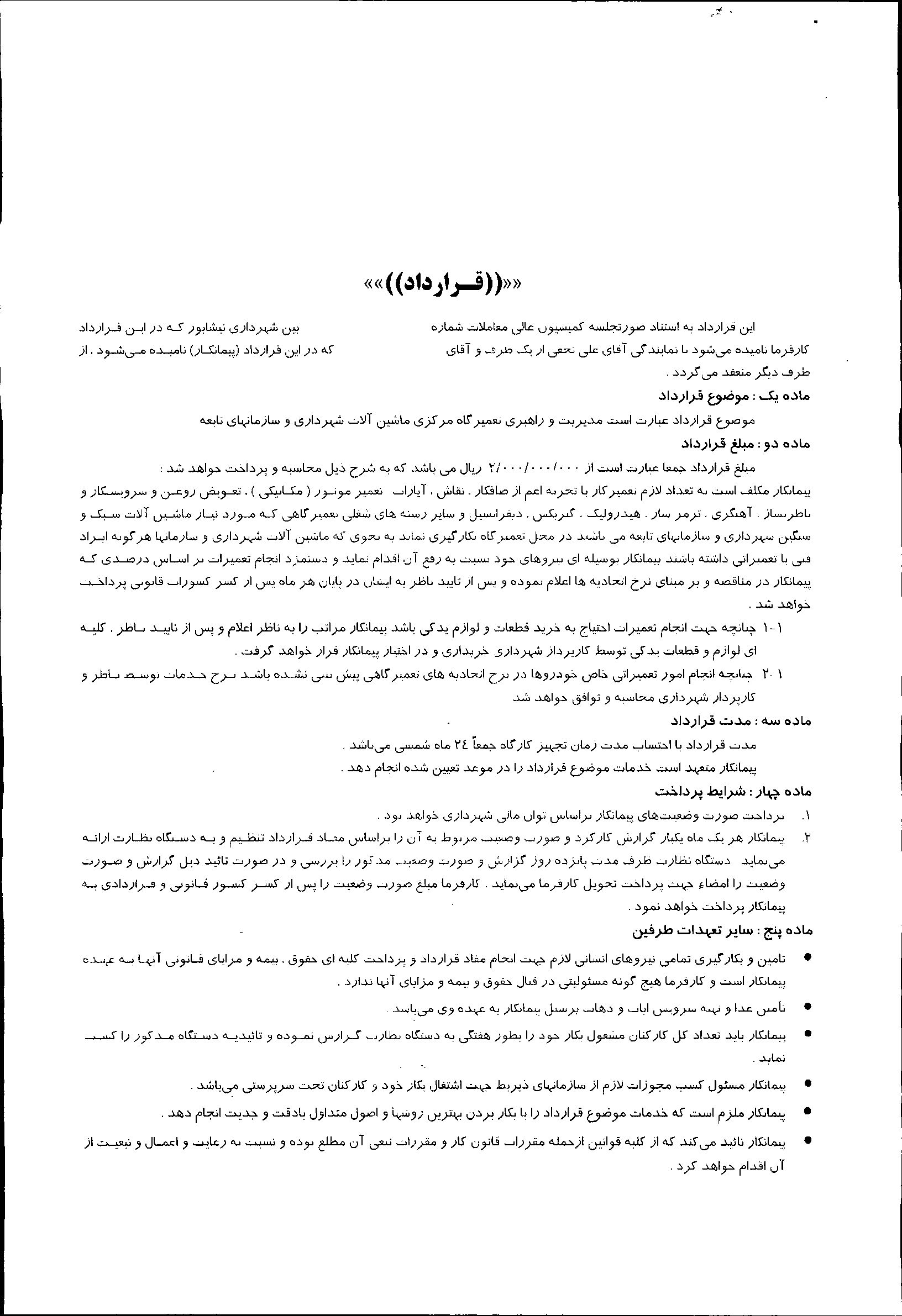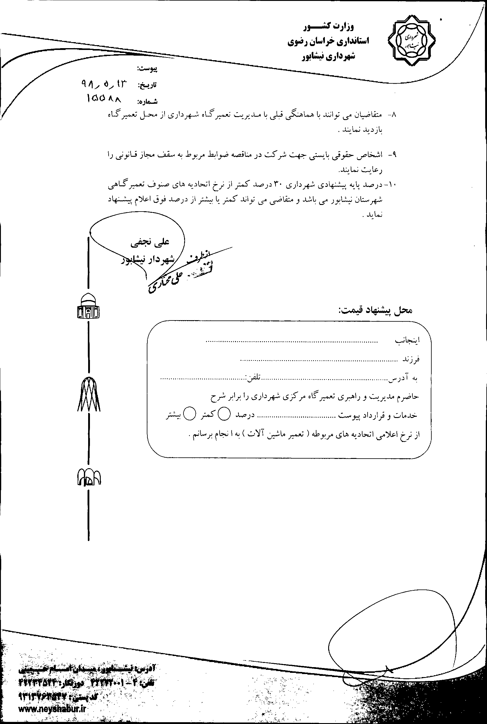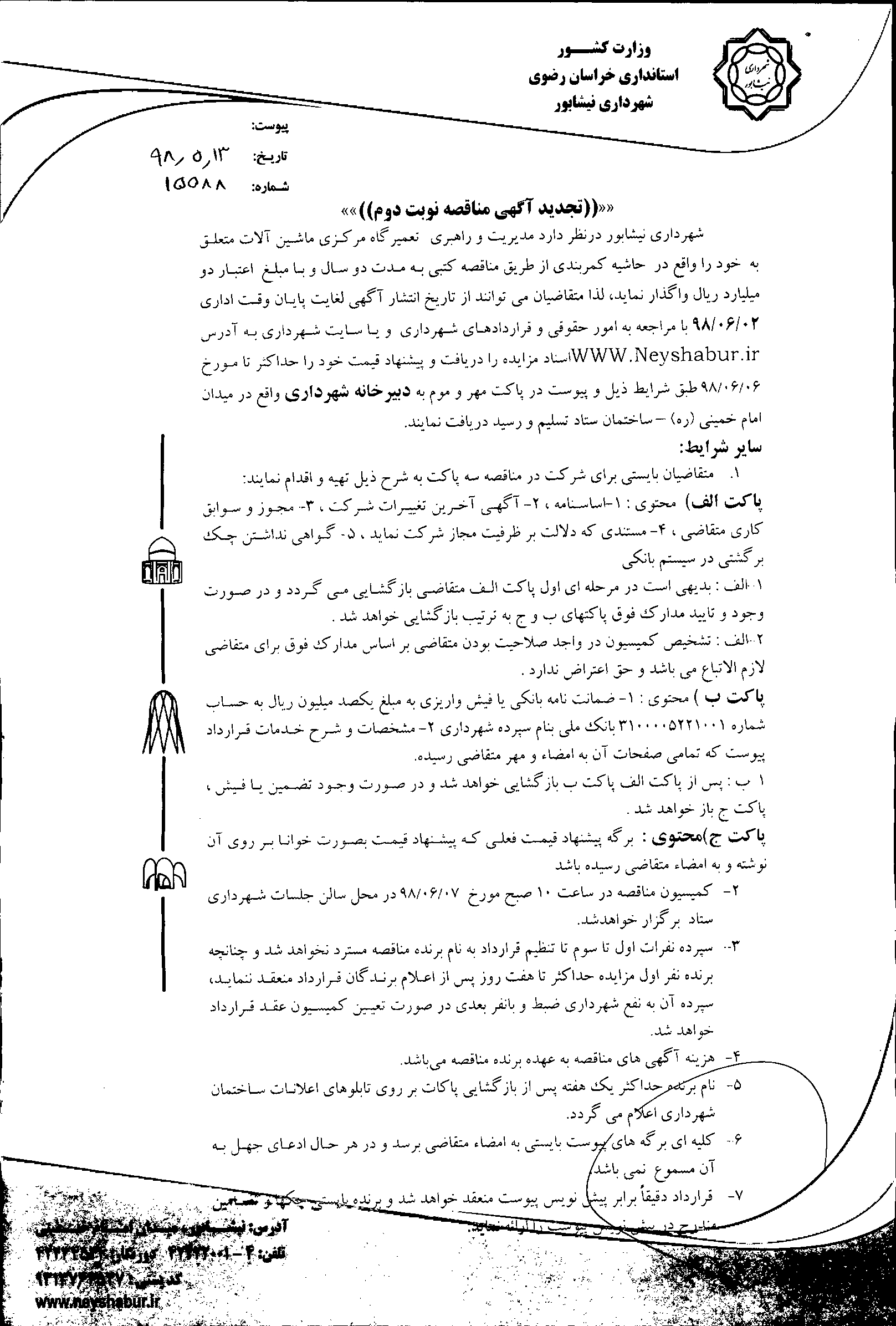 نظر به اينكه شهرداري نيشابور در نظر دارد نسبت به واگذاري مديريت و راهبري تعميرگاه مركزي ماشين آلات از طريق برگزاري مناقصه به بخش خصوصي واجد صلاحيت قانوني و فني براي مدت دو سال اقدام نمايد ، لذا از كليه اشخاص حقيقي يا حقوقي داراي صلاحيت و تجربه دعوت به عمل مي آيد جهت دريافت اسناد مناقصه و اطلاعات تكميلي به امور حقوقي و قراردادهاي شهرداري نيشابور به آدرس : نيشابور – ميدان امام – ساختمان ستاد و يا سايت شهرداري به آدرس WWW.Neyshabur.ir مراجعه نمايد .